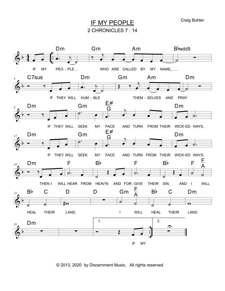 More than ever, in this chaotic season, we all need to “pray without ceasing” (1 Thessalonians 5:17). “The effectual fervent prayer of a righteous person availeth much” (James 5:16) Here is a new musical setting of that powerful Scripture found in 2 Chronicles 7:14, “If My people who are called by My Name.” A chart is given below, in case you want to sing this song.